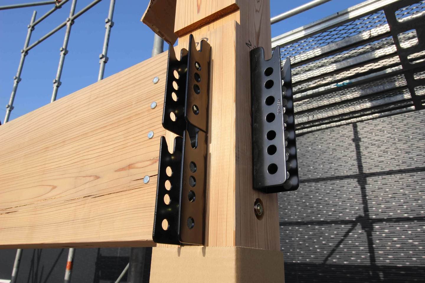 KS構法の仕口では断面欠損が少なく安全性の高い金物工法を用いています。金物工法では、木痩せによるボルトの緩みがおきたり、 ボルトがめり込む不安があるため集成材を使用することが一般的ですが、KS 構法では連結部に、木構造生産技術研究所で開発された KSジベル(特許取得)を採用することで、国産材での金物工法を確立しました。