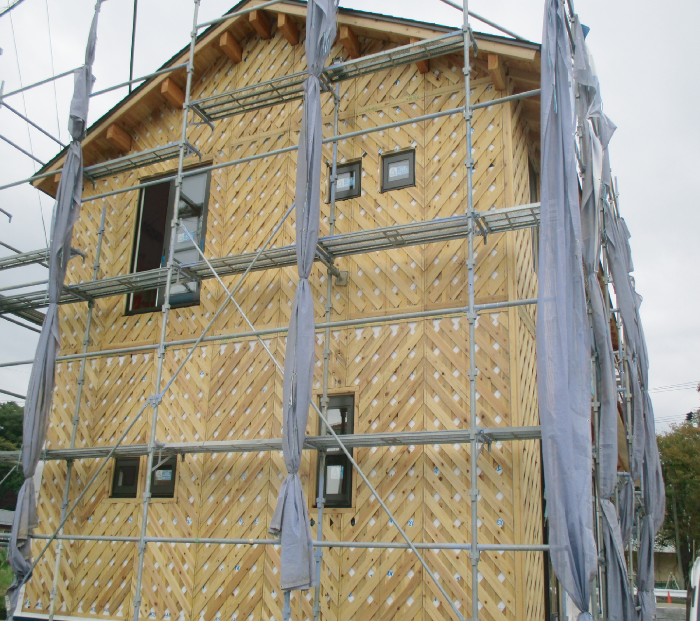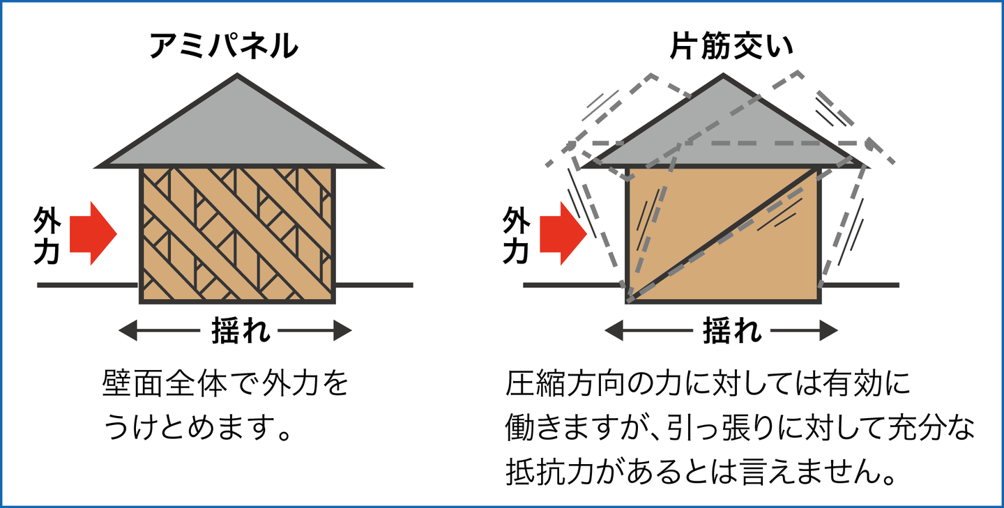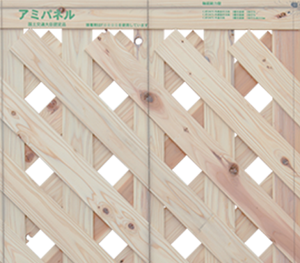 高い耐震性と通気性と透湿性を兼ねた、木で作られたアミ状のパネルで、国産杉の小幅板を斜め格子状に3層積層した耐力面材です。銘木『秋田杉』を材料にし、その間伐材を利用して作られています。また間伐材の中でも木目の締まった素材を厳選して乾燥させ、含水率15%以下の杉材がアミパネルの原料として使用されています。