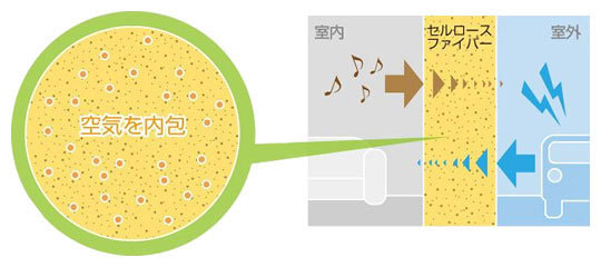 セルロースファイバーは、繊維1本1本に空気を含んでいます。この厚い空気の層が、音を吸収し、伝えにくくする性質を持っています。また、高密度で充填施工しますので、高い吸音・遮音性能が発揮されます。