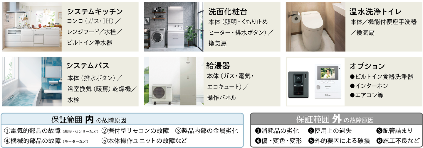 キッチン・トイレ・バスなどの住宅設備機器を保証対象として10年間何度でも修理・交換いたします!