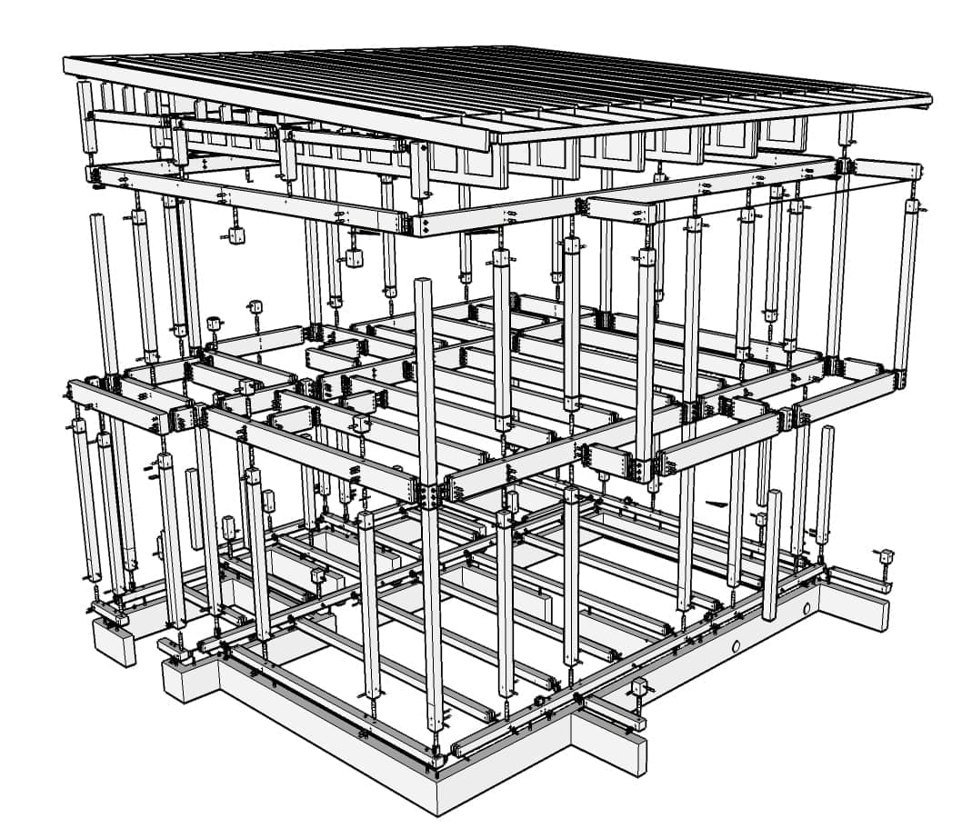 KS構法の仕口では断面欠損が少なく安全性の高い金物工法を用いています。金物工法では、木痩せによるボルトの緩みがおきたり、 ボルトがめり込む不安があるため集成材を使用することが一般的ですが、KS 構法では連結部に、木構造生産技術研究所で開発された KSジベル(特許取得)を採用することで、国産材での金物工法を確立しました。