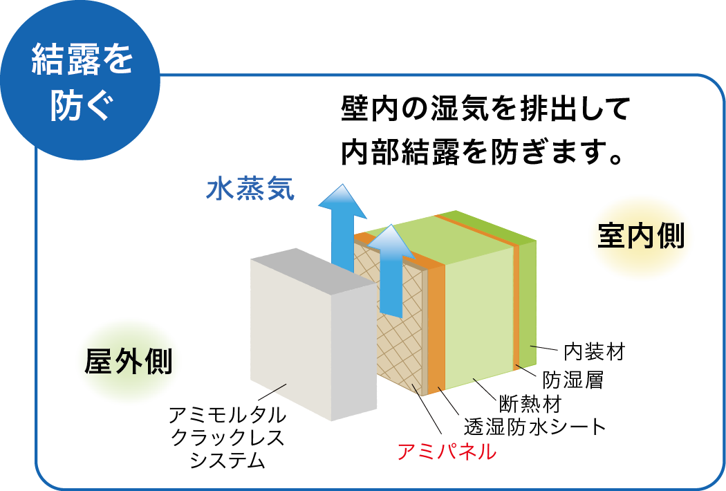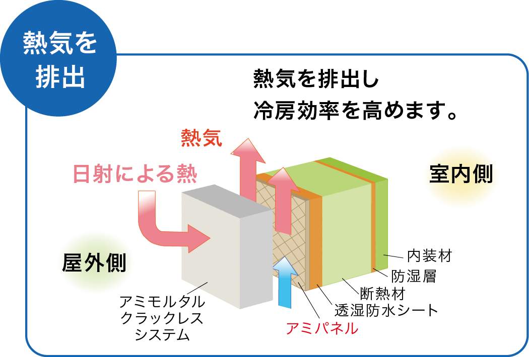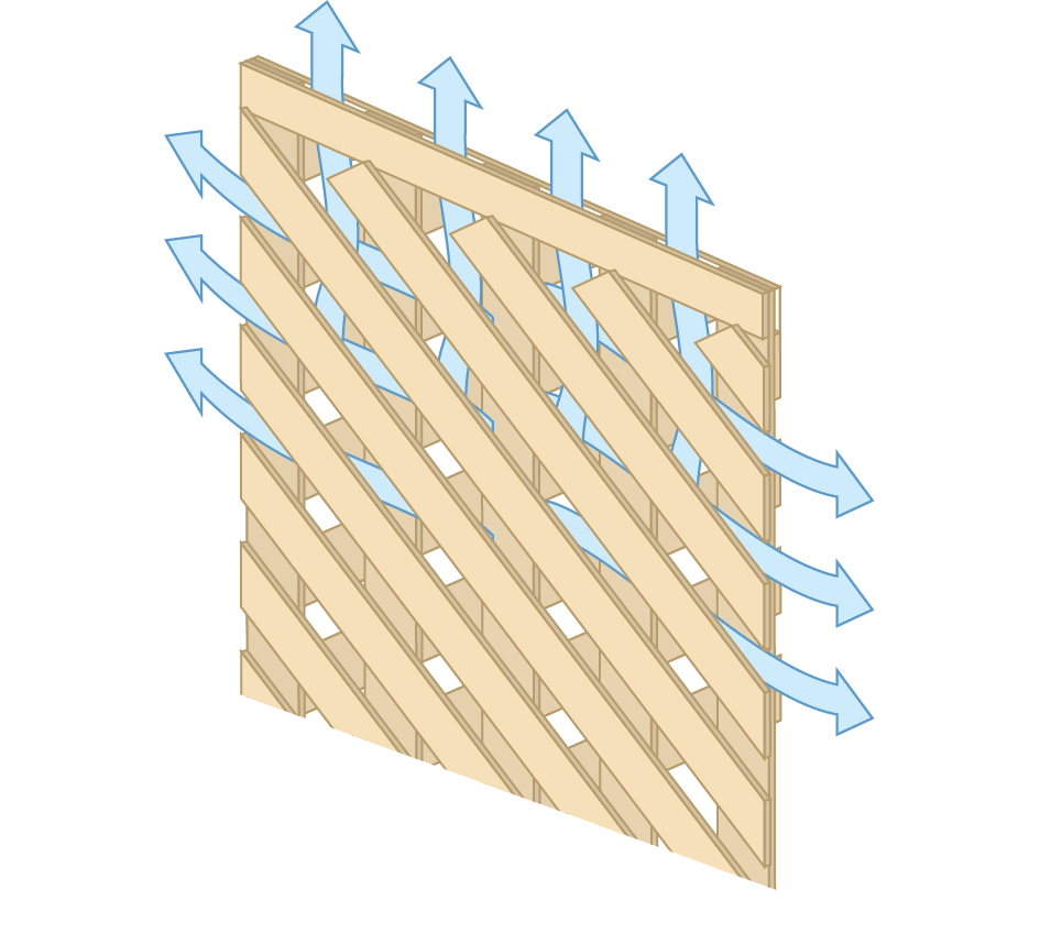 上下左右に通気がとれるので、湿気を効率よく排出します。住宅の外壁表面温度は、夏場で70度以上にまで上昇します。通気層は上昇気流を発生させ、空気を循環させます。従来の通気工法では北面のカビや藻など、日照が少ない壁にも、左右にも空気の流れを作ることができ、北面の湿気こもりを予防する事ができます。