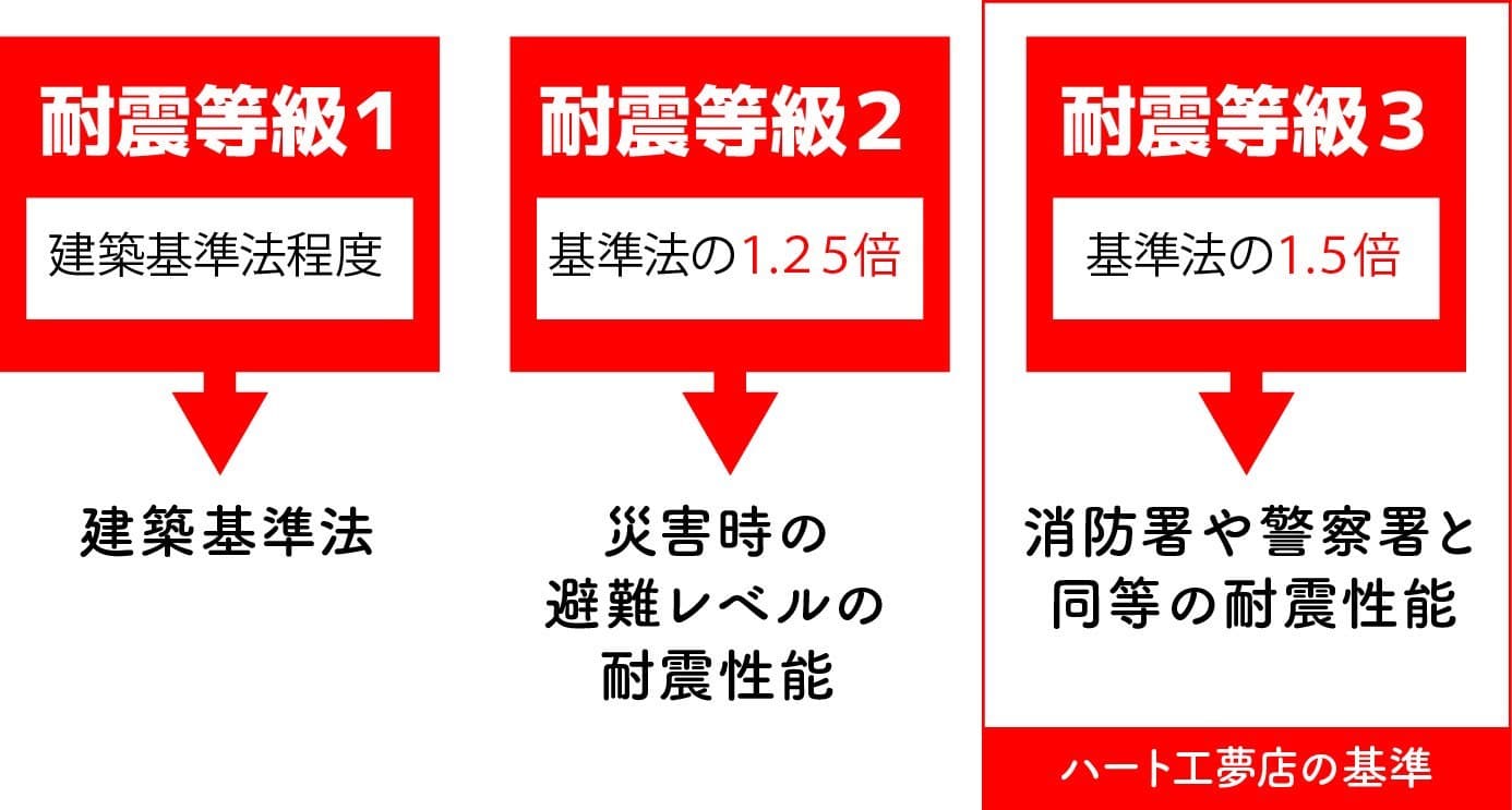 ハート工夢店はの家は耐震性能の最高ランクである耐震等級3を標準仕様としています。