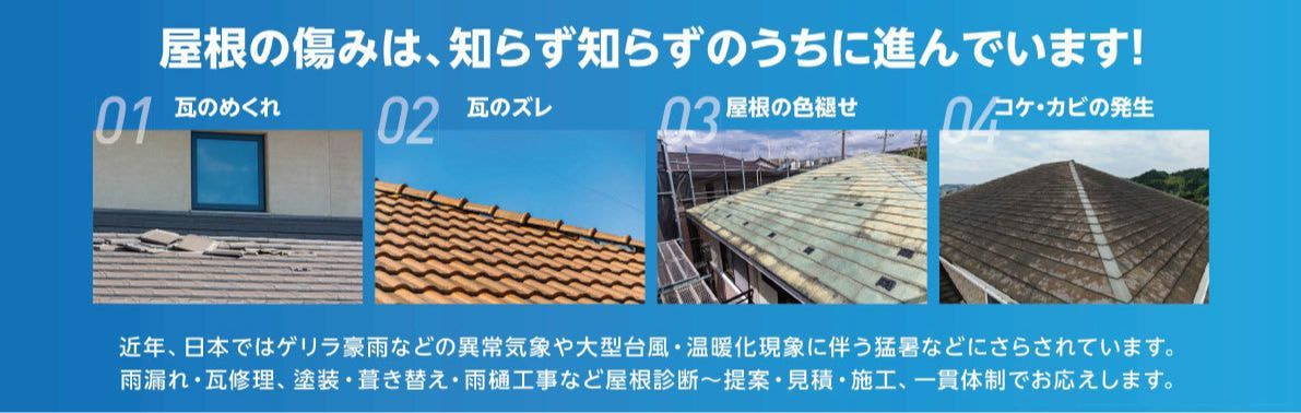 しかし、日々ダメージを受け、下から見えないだけに気づかぬうちに痛みが進んでいます。気づいた時は手遅れとならないよう、屋根の健康診断は必須です。屋根を見直すきっかけにしませんか?屋根の専門家が点検して屋根の状況を報告します!