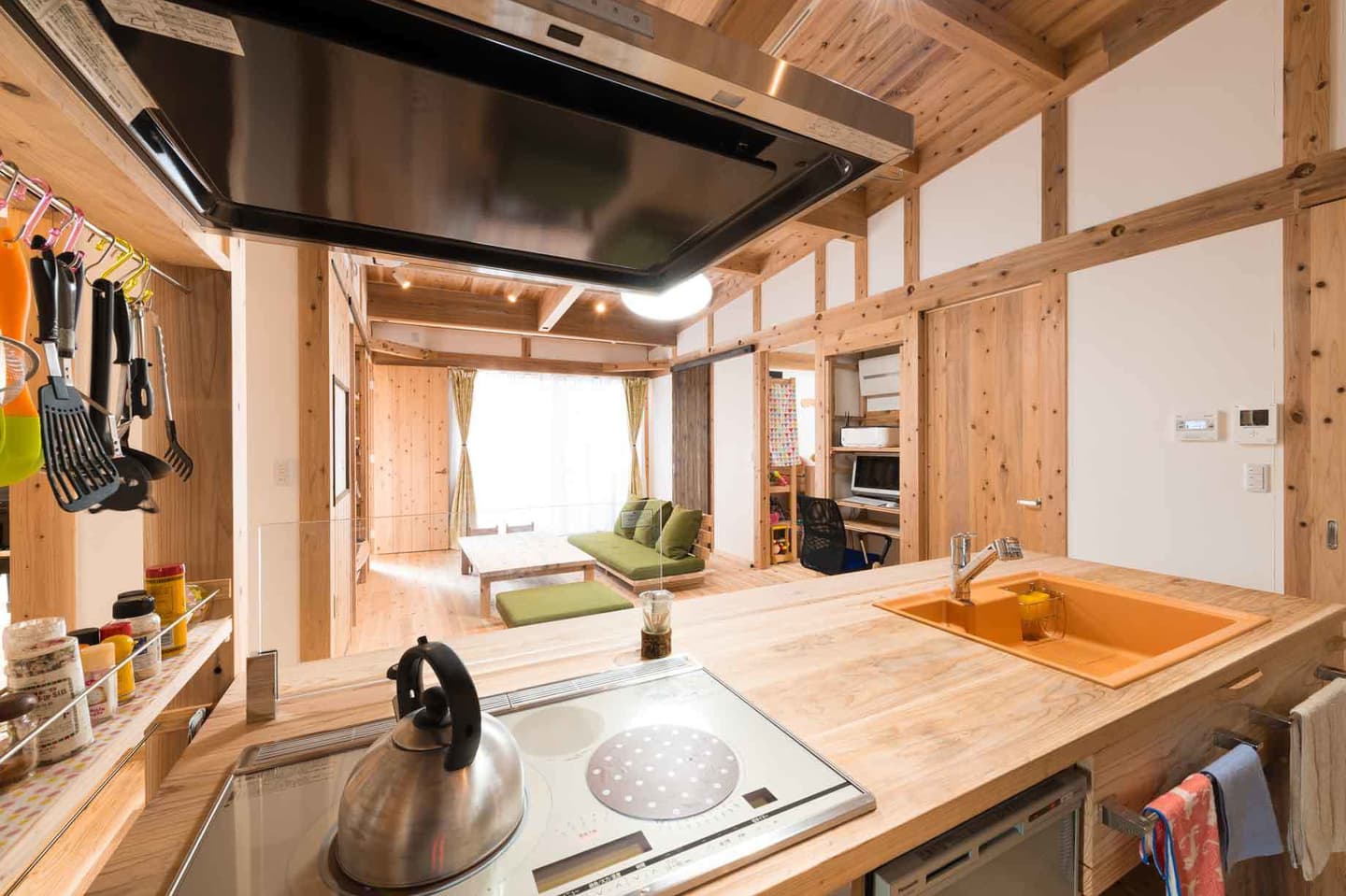 「夏はさらっと涼しく、冬はじんわり暖かい。だから、我が家はリビングにラグがないし、キッチンやお風呂にもマットを敷いてません」と奥様。ご主人も「子どもたちは裸足で駆け回ったり、床にゴロンと寝転がったり。とても気に入ってます」