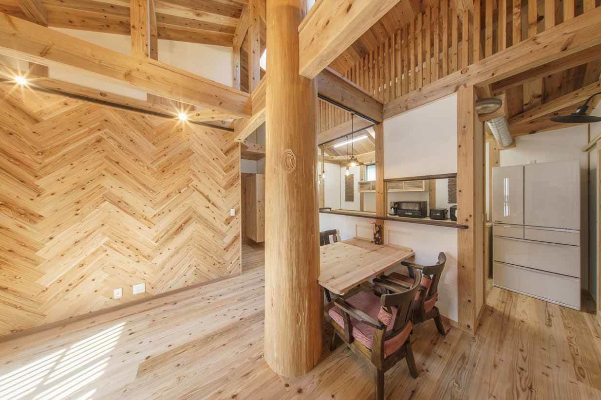 リビングルームの中心には、ご主人が展示場で一目惚れしたという、直径60㎝を超える「親父柱」が堂々と鎮座。「家をぐるりと見渡したとき、ヘリンボーンだったり、キャットウォークだったり、同じ杉でもさまざまなデザインが盛り込まれてるところがお気に入りなんです」と奥様も満足している様子。