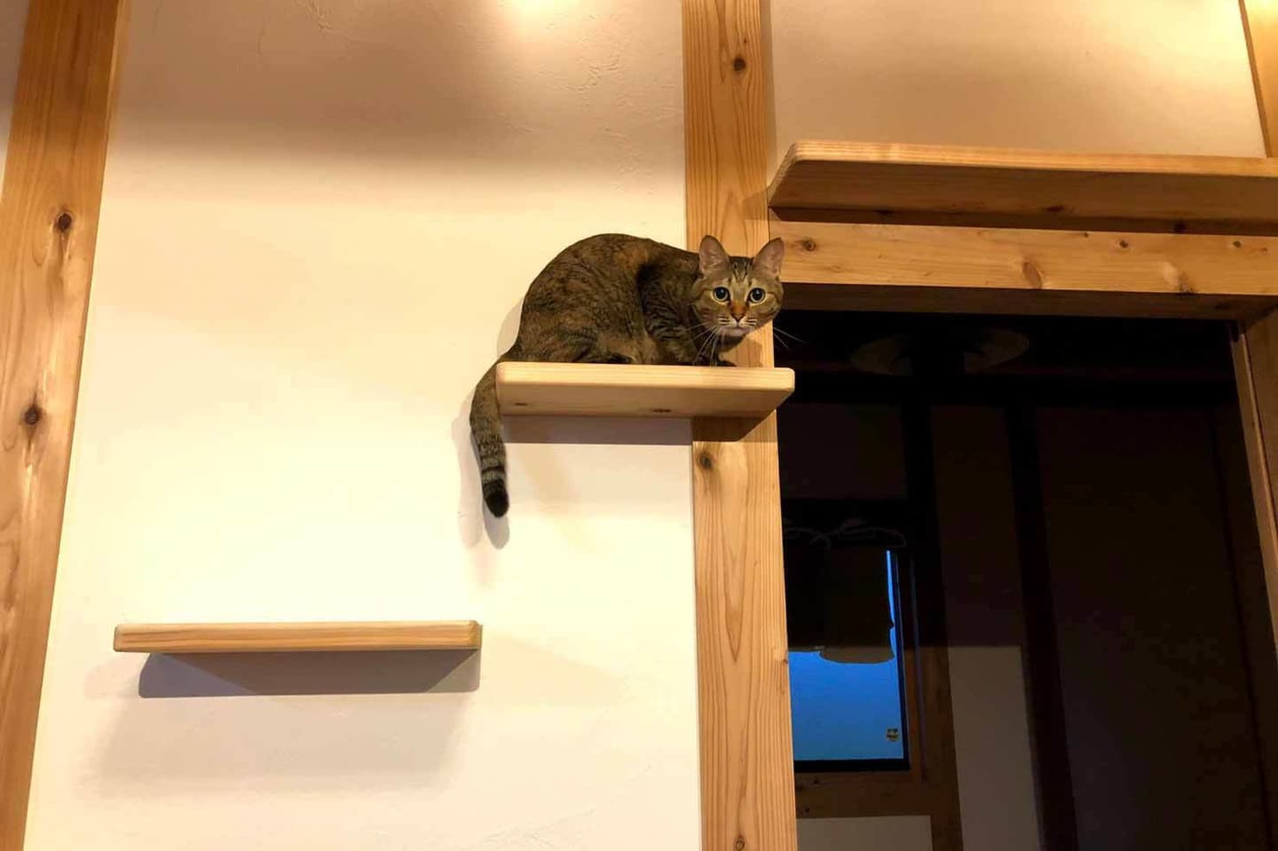 「梁づたいにキャットウォークを設けてもらい、天井の猫用通路は、強化ガラスでスケルトンになっていたり、梁に沿って寝室につながっていたりと、遊び心満載で、以前は寝室だけで飼っていたので、今は猫たちもイキイキしてるし、すごく楽しそう。そんな姿を見ることができて私たちも幸せです」
