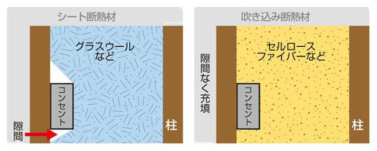 断熱材に小さな隙間があると、その部分が冷やされたり暖められたりします。この温度差が結露の原因になります。セルロースファイバーは隙間なく施工することで透湿性、吸放湿性を持った、結露に強い断熱材です。