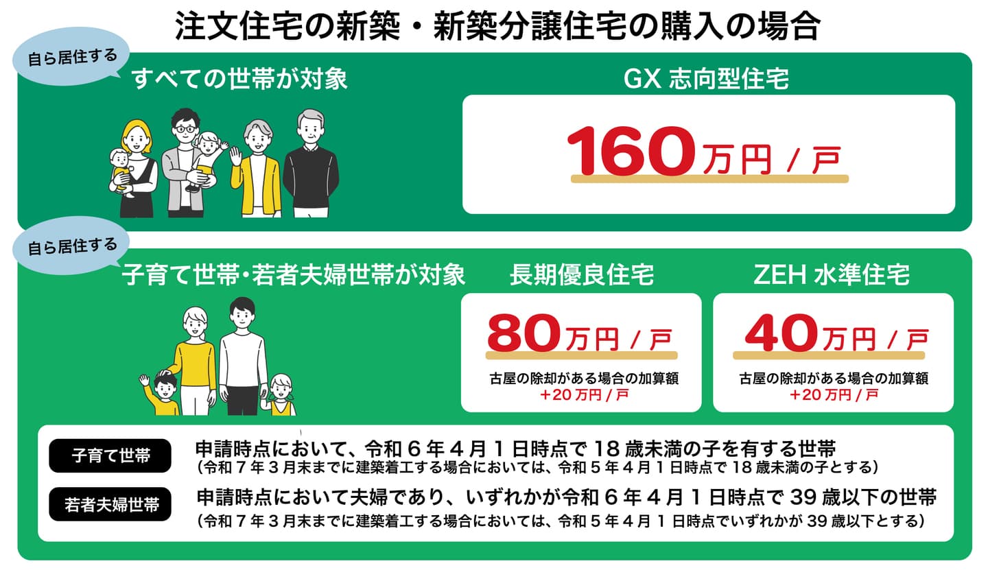 子育てグリーン住宅支援事業は、2050年カーボンニュートラルの実現に向け、新築住宅について、エエネルギー価格などの物価高騰の影響を特に受けやすい子育て世帯などに対して、「ZEH基準の水準を大きく上回る省ネ住宅」の 導入や、2030年度までの「新築住宅のZEH基準の水準の省エネルギー性能確保」の義務化に向けた裾野の広い 支援を行う事業です。