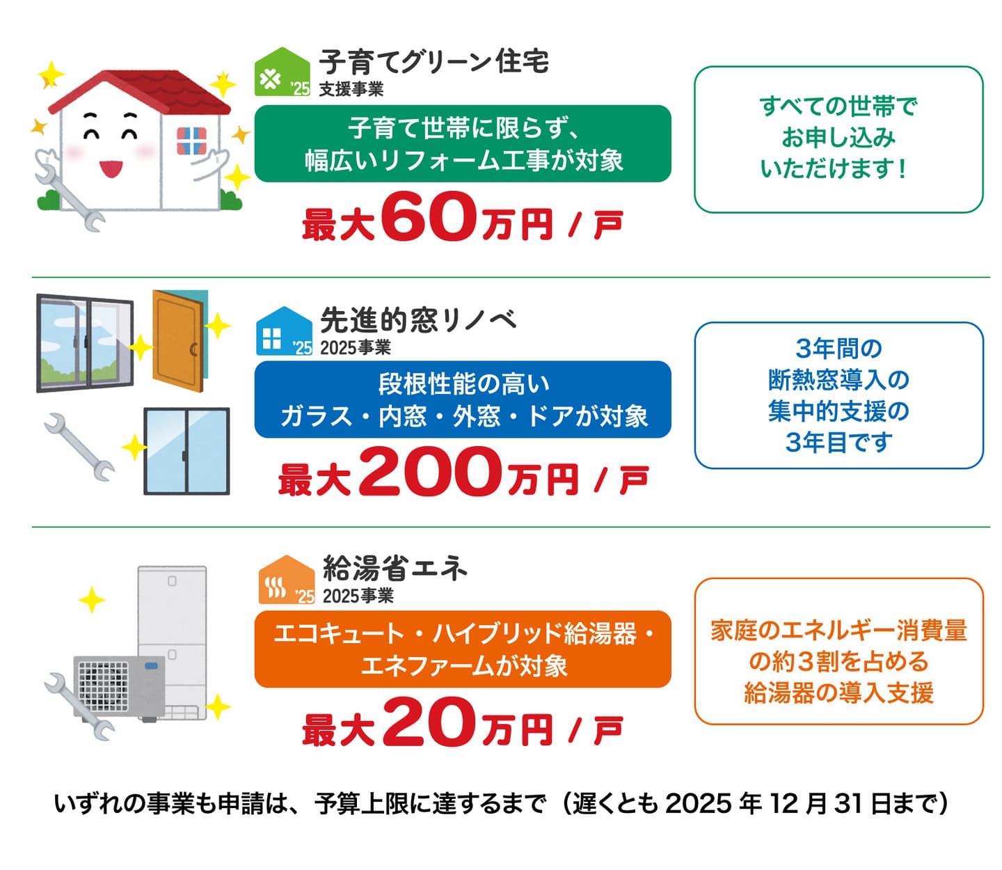 住宅省エネ2025キャンベーンは、国土交通省、経済産業省、環境省が連携して家庭部門の省エネ化を促進する目的で行う新築とリフォームを対象にした4つの補助事業です。そのうちリフォーム工事は、子育て世帯に限らずすべての世帯が対象になります。